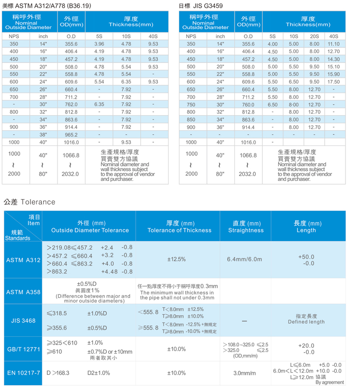 大口徑不銹鋼工業(yè)配管由壹灣璋偉鋼鐵機械股份有限公司引進全中國第一壹24"錢上單焊縫制管機組,并配有錢上固熔化熱處理爐,無論在焊縫、員圓度、直錢度皆是綾外(UOE)焊接成型無法比擬的,直接提升國內(nèi)大口徑管徑的成品工藝,大大滿足石油、化學、染整等區(qū)域的需求。